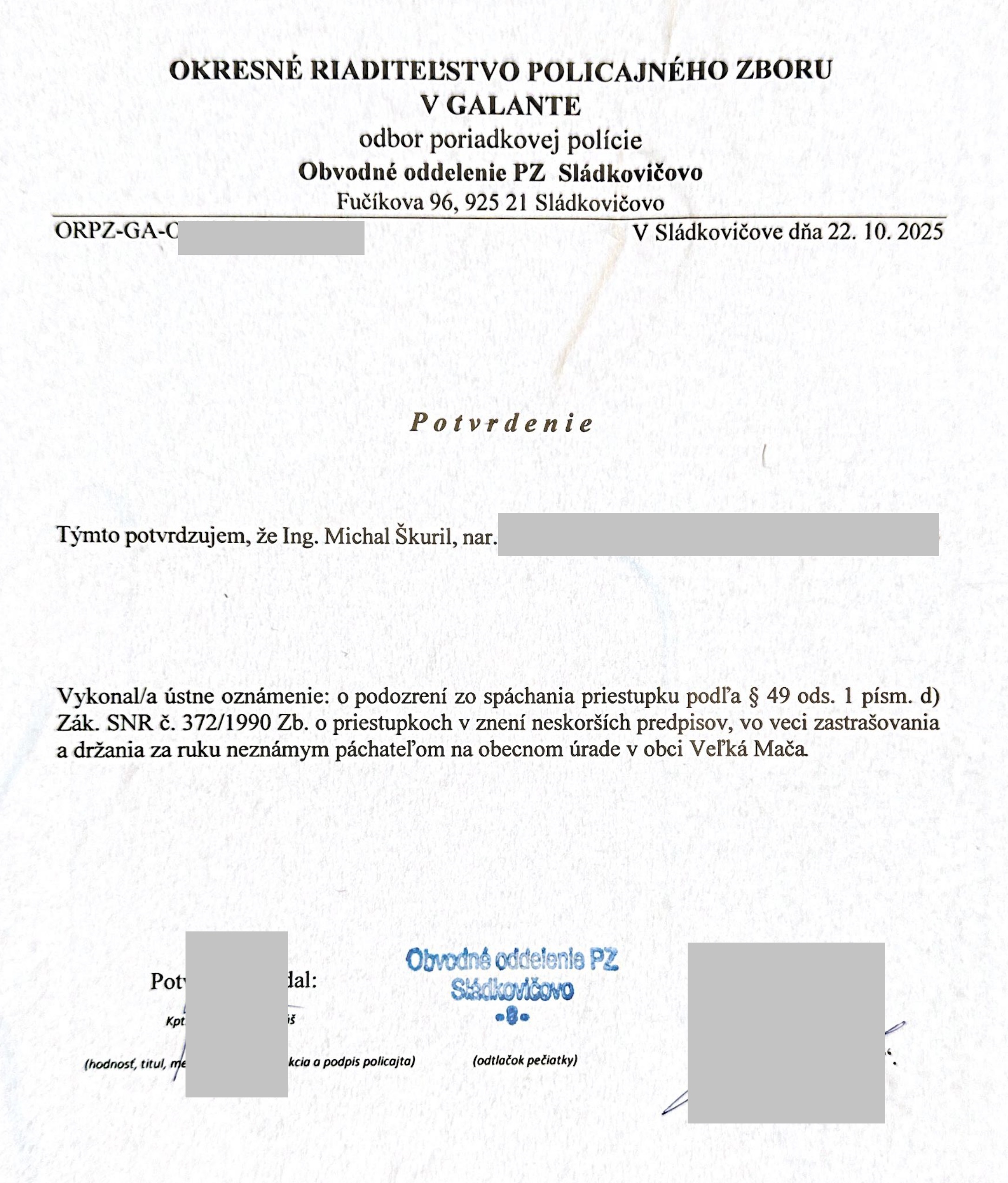 K uvedeným udalostiam z polície existuje aj oficiálny záznam. V súvislosti s podozrením zo zastrašovania na obecnom úrade som vykonal aj ústne oznámenie na polícii.